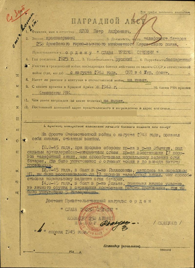 Мой дедушка Ялов Пётр Андреевич, по маминой линии, 1925 г.р., на фронте Отечественой войны с августа 1943 года. Место призыва: Каменский РВК .