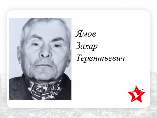 Ямов Захар Терентьевич. Дата рождения 19.09.1910 года. Призван на фронт из Упоровского района, д. Кашаир. Был связистом. Воевал с июля 1941 по май 1945 г. Контужен, много ранений. Имел много наград.