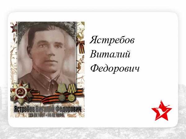 Виталий Фёдорович Ястребов - родной дядя моего мужа. Воевал всю войну, и продолжал войну на Дальнем востоке. Умер в 1956г от ран. Ему было всего 39 лет.