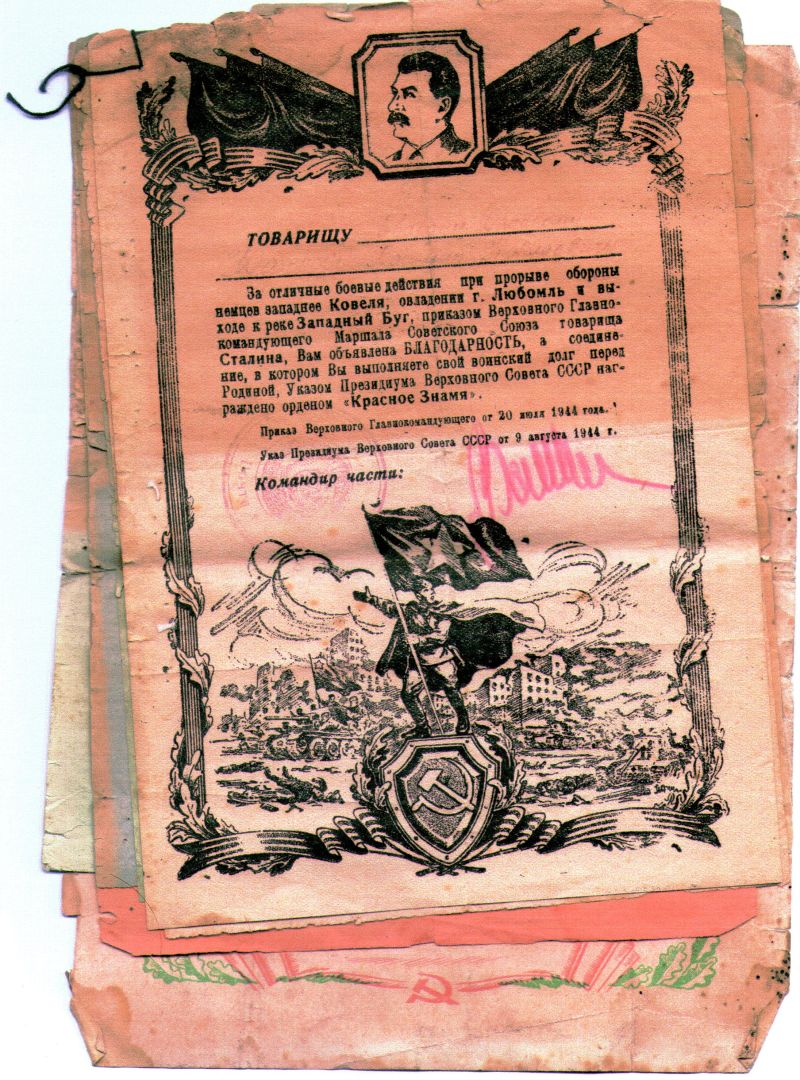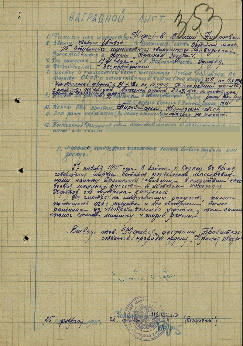 Мой дед Юферев Василий Николаевич, родился в д. Ст. Зяногурт Тыловайского района Удмуртской АССР 20 апреля 1912 года, в обычной крестьянской семье, где прожил и проработал всю свою трудовую жизнь. В 1934 году был призван на срочную службу в ряды Красной Армии в бронетанковый полк, в 1935 году уволен в запас (как указано в военном билете – по болезни). 20 февраля 1940 года призван по мобилизации на «Финскую войну», но со слов моей мамы: «пока в поезде ехал на войну – та закончилась», вернулся в родную деревню, после чего с 23 июня 1941 года по 8 октября 1945 года защищал нашу Родину, победу встретил в Берлине 09 мая 1945 года (фото внизу слева). До сентября 1942 года воевал в артиллерийском полку - орудийным номером. Был трижды ранен, один раз ранение было тяжелое… Из воспоминаний деда: «Сидим с боевыми товарищами после боя, отдыхаем вокруг костра – вдруг в самый центр попадает бомба…, нашли меня в каком-то подвале, очнулся в госпитале, потом узнаю что из всех там находившихся - я один жив остался!». Дед рассказывал бабушке – «если бы я остался дальше в пехоте воевать, живым бы точно не пришел». С сентября 1942 года по май 1945 года – воевал в 115-м гвардейском минометном дивизионе – помощником шофера на легендарной «Катюше». Из воспоминаний: чтоб врагу «Катюша» не досталась, на каждой машине был взрыватель, бывало что специально топили машину в реке… Из архивов Министерства Обороны: принимал участие в боевых действиях на Центральном, Юго-западном, Западном, 1-м Белорусском фронтах. Награжден «Орденом Красной звезды», медалью «За Победу над Германией», «За взятие Берлина», «За освобождение Варшавы». Из наградного листа № 353 на орден «Красная звезда»: «27 января 1945 года в районе г. Седлец во время совершения марша батарея подверглась массированному налету вражеской авиации в следствии чего боевая машина расчета в котором находился Юферев от обстрела загорелась. Не смотря на смертельную опасность, помог потушить очаг пожара и под обстрелом вынес раненных из обстреливаемого участка, тем самым помог спасти машину и жизни раненых»… После войны, до пенсии, дед проработал бухгалтером в родной деревне, в 1982 году переехал в г. Воткинск, куда их с бабушкой перевезли мои родители, умер он в 1992 году возрасте 80 лет.
