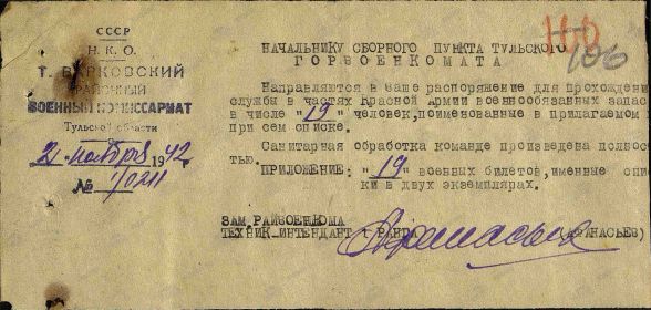 26.10.1942г. Место призыва : Дедиловский РВК Тульской обл.