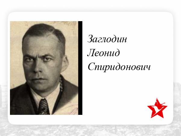Заглодин Леонид Спиридонович, мой старший сослуживец и, в некотором смысле, наставник, родился в 1902 году в Москве, по разговорам, в купеческой семье.. В одной из ОБД Минобороны он представлен как старший лейтенант- инженер. Никаких сведений о конкретике участия в ВОВ нет.