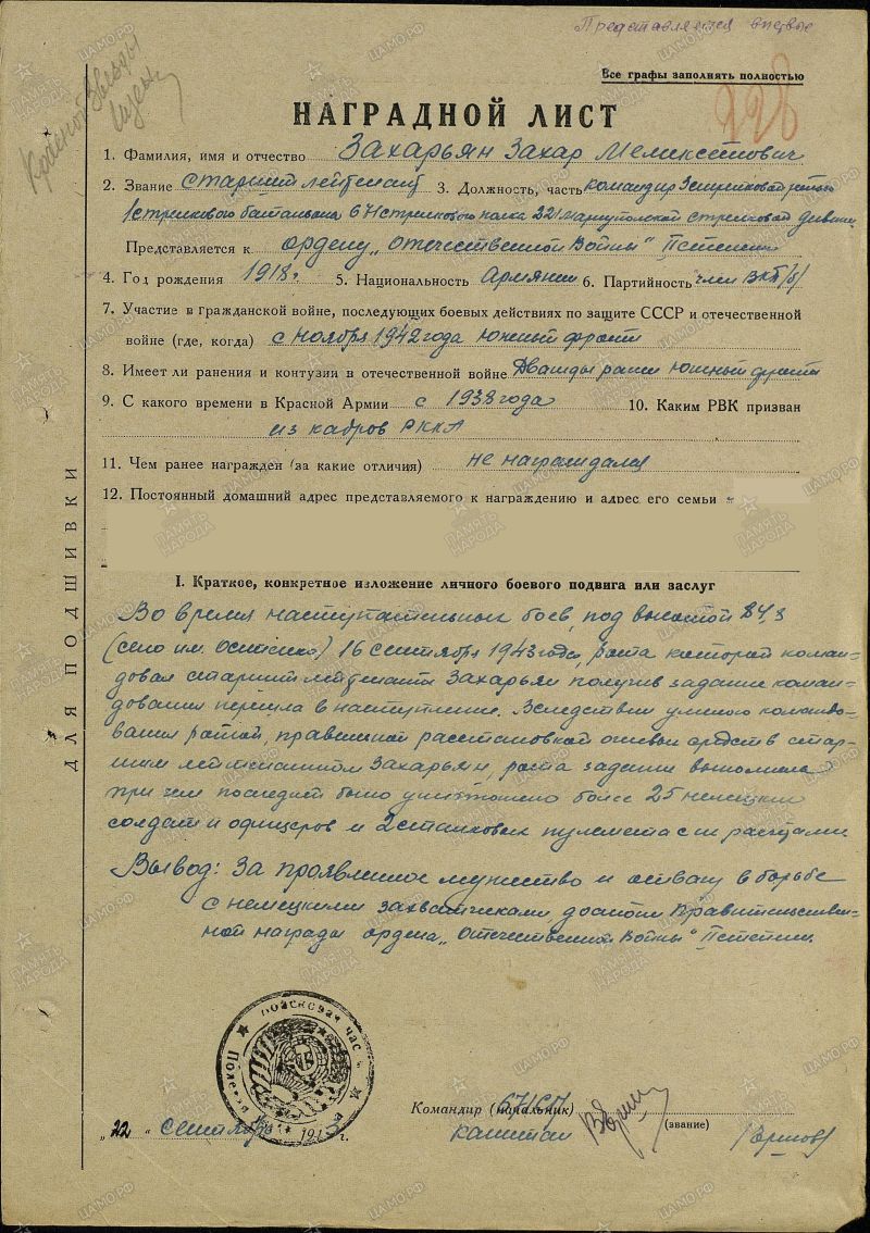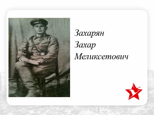 Два брата Ст.Лейтенант Захарян Захар Меликсетович родился в1918г.в был призван в ряды рабоче крестьянской Армии в 1936году был участником финской Великую отечественную встретил в рядах красной Армии в звании ст. Лейтенант ! участник битвы за Сталинград в 1943г. пропал без вести на Украине в 2014г найдена его могила в станице Светлодолинское Запорожской области его брат Мехак рядовой участник битвы за Кавказ полный ковалер ордена отечественной войны в 1943 г.под Моздоком получил тяжелейшее ранение и был демобилизован!