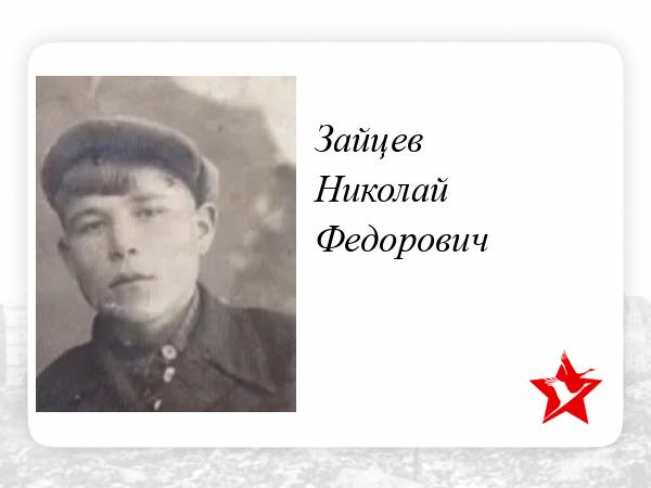 Зайцев Николай Фёдорович 1926 года рождения. Был призван на фронт в феврале 1944 года, в возрасте 18 лет. Участвовал в освобождении Минска, в прорыве Обороны противника на Бобруйском направлении, освобождении ж/д станции Бобруйск. Погиб в Калининградской обл, Зеленоградский район в феврале 1945 года в звании сержанта.