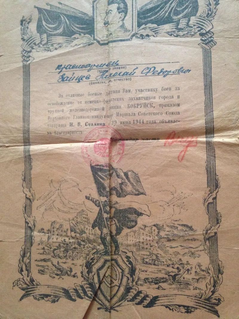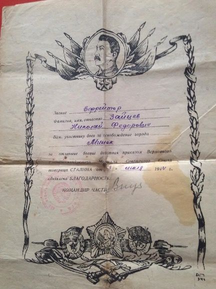 Зайцев Николай Федорович, родился 15.01.1926 г. в г.Чкалове. Это мой двоюродный дедушка. В 18 лет был призван на фронт. Получил три Сталинские Благодарности за отличные боевые действия при освобождении Минска, при прорыве Обороны противника в Бобруйском направлении и при освобождении ж/д Станции Бобруйск. На обратной стороне Благодарностей написаны письма моего деда, которые бережно сохранены моей мамой. Больше писем с фронта не приходило. И Родные считали деда "пропавшим без вести" . Но благодаря архивным данным, удалось узнать, что мой дедушка погиб 03.02.1945г. в звании сержанта в боях под Калининградом, в возрасте 19-ти