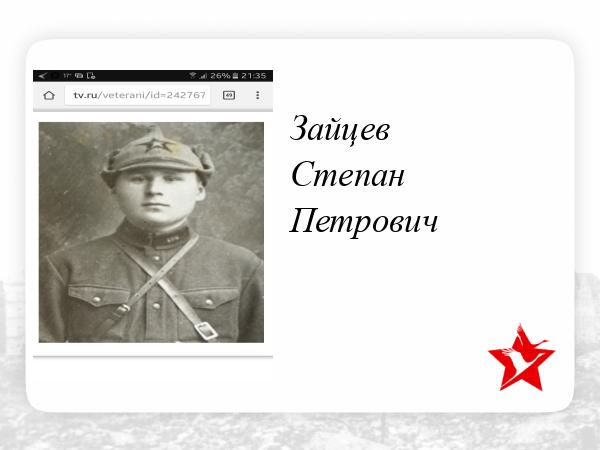 Зайцев Степан Петрович, призван в 1941 г., погиб в 1942 г, в дер. Красная Горка, Юхновского р-на, Калужской обл. от рук снайпера. Захоронен в Воинском Мемориале в Калужской области. В мирное время был бухгалтером. После его смерти осталась сиротой 2х годовалая дочь Тамара. Моя бабушка Степанида всю жизнь ждала деда Степана и больше так и не вышла замуж. Мы: Дочь - Тамара Степановна, внучка - Екатерина, правнучки - Юлия и София, помним и чтим память нашего деда!