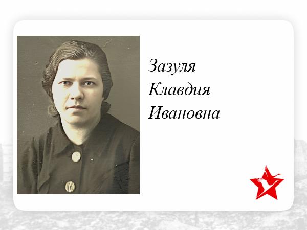 Зазуля Клавдия Яковлевна родилась 20 марта 1911 года в Читинской области, Оловяннинском районе, раб.пос. Оловянная. Русская.