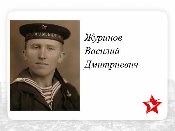 Журинов Василий Дмитриевич родился 7 января 1917 года в д. Звонец Дрегельского р-на Ленинградской области. В 1938 году его призвали служить на Балтийский ВМФ, в то время на флоте служили 5 лет. Во время службы в 1941 году началась война.