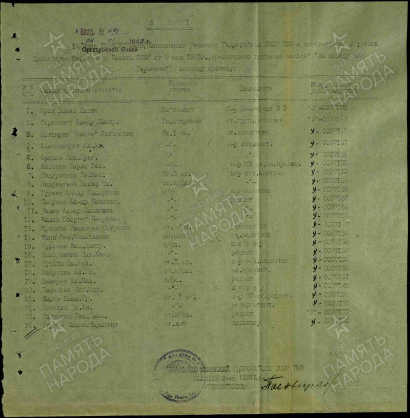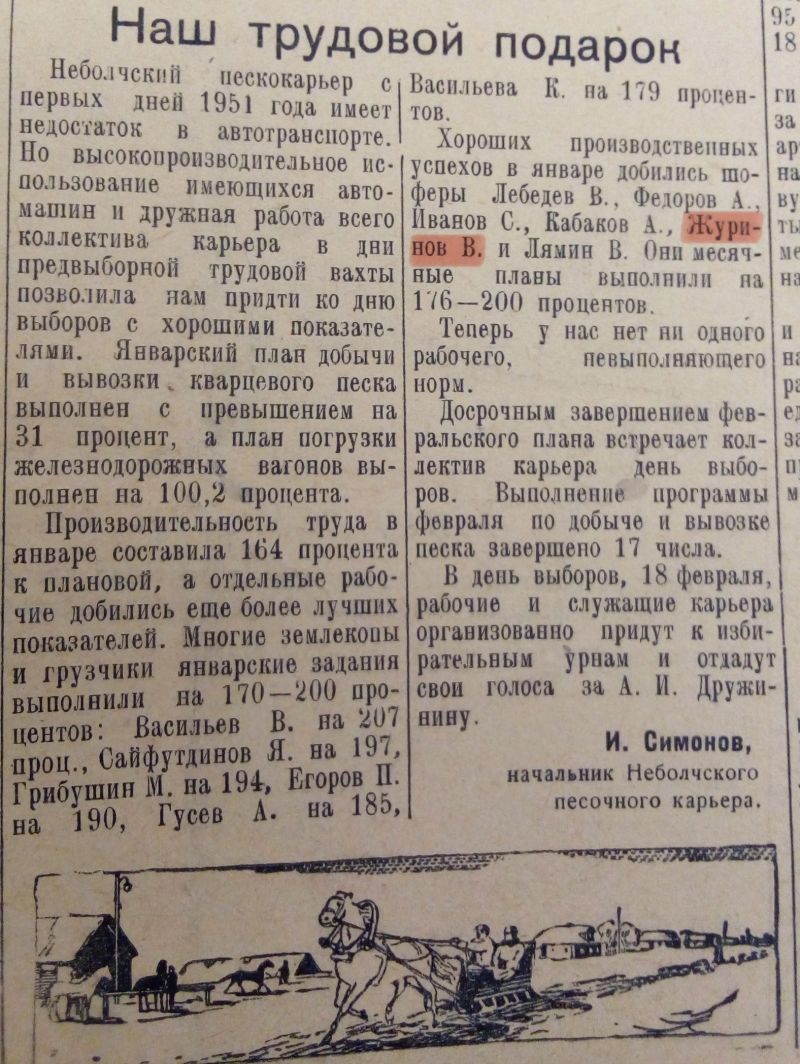 За время Отечественной войны к/ф Журинов показал себя достойным защитником своей Родины, предан делу партий Ленина-Сталина.