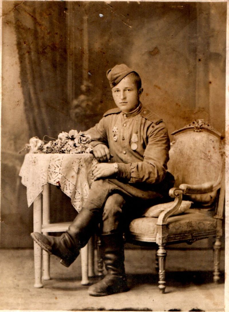 Ушел на фронт в 1943 году в 17 лет. Прошел всю войну: участвовал в 1 Украинском, 3 Украинском фронтах. Освобождал Венгрию, Австрию. День победы 1945 года встретил в Вене.